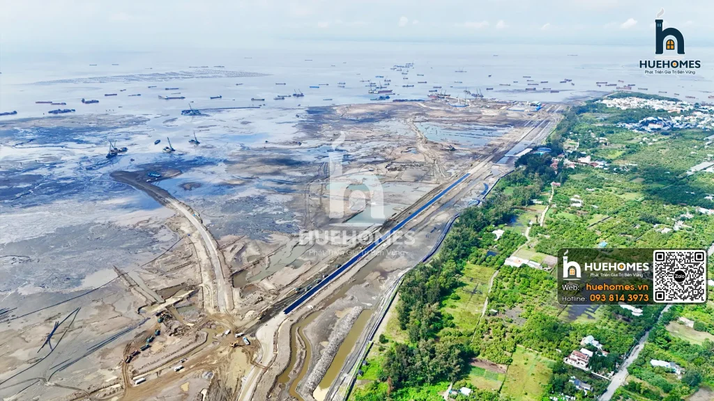 - Lấn biển giai đoạn 1 (đắp nền + chống xói lở) được công bố hoàn thành hoặc gần hoàn thành.