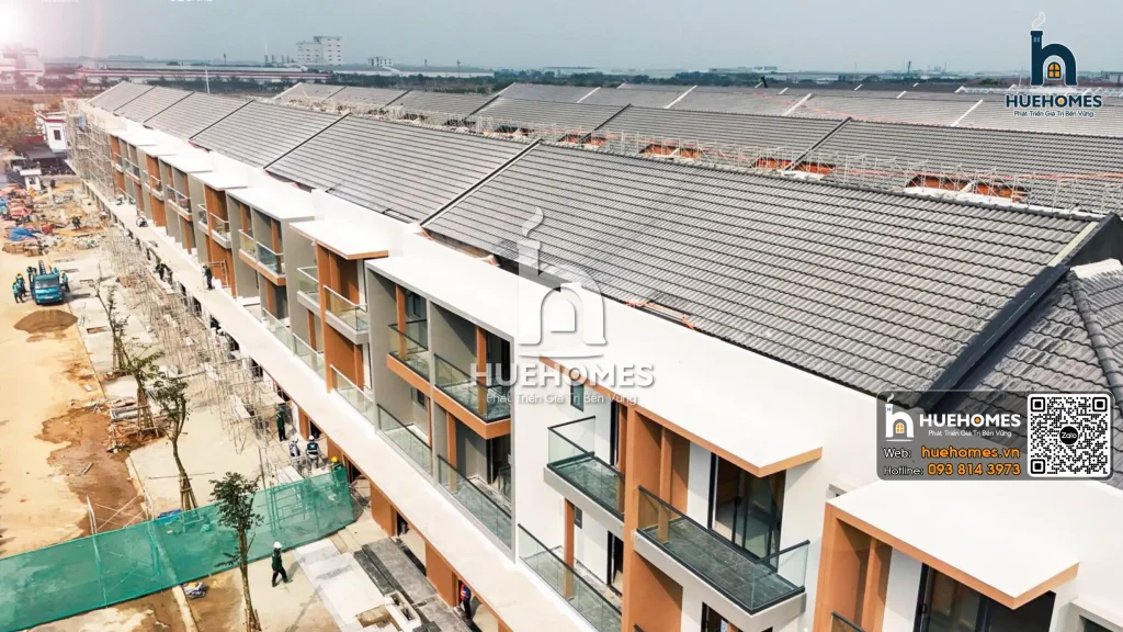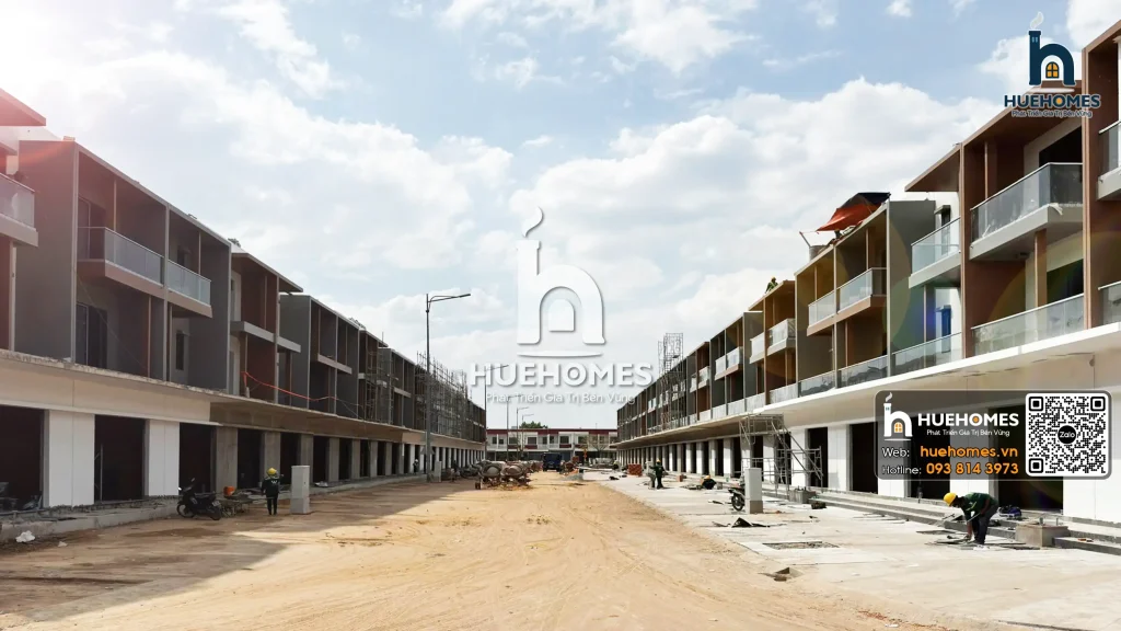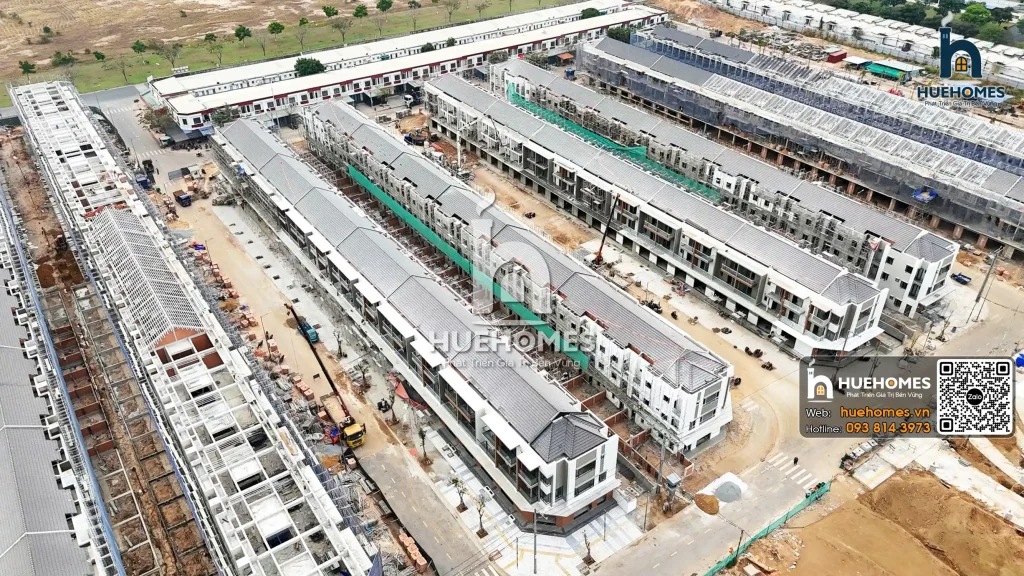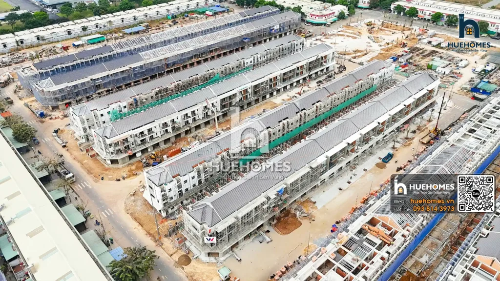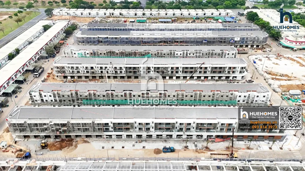 Tính đến tháng 1/2026, các dãy shophouse dọc trục đường chính đã hoàn thiện phần khung thô: